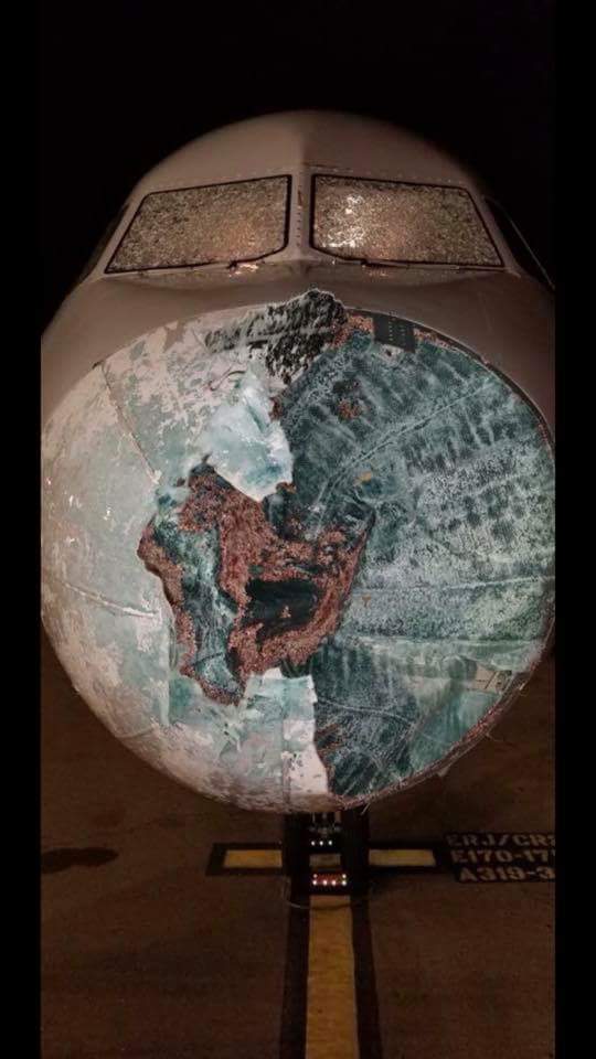Shefi Qendrës së Meteorologjisë, KOCO (OKC).CBM, Damon Lane nga Oklahoma në rrjetin social Twitter shkruan se avioni i American Airlines në fluturimin nga Antonio drejtë Los Angeles u ndesh me një stuhi të fuqishme, ndërsa ishte në Teksasin Perëndimor. “Duhej të bënte një ulje emergjente në El Paso. Ja pse. Hunda e avionit nuk duhet të duket kështu,” thekson meteorologu amerikan Dane duke e shoqëruar twittin e tij me foto të frikshme: