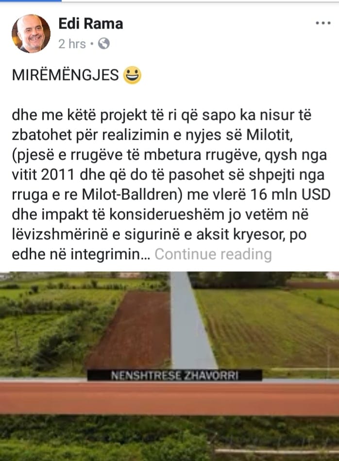 Po, ky është kryeministri Edi Rama. Me idenë se ka marrë pushtetin në vitin 2011, ai mëngjesin e së premtes e nis me lajmin se projektin e ri, që sipas tij, sapo ka nisur të zbatohet për realizimin e nyjes së Milotit, (pjesë e rrugëve të mbetura rrugëve, qysh nga vitit 2011 dhe që do të pasohet së shpejti nga rruga e re Milot-Balldren) me vlerë 16 mln USD .