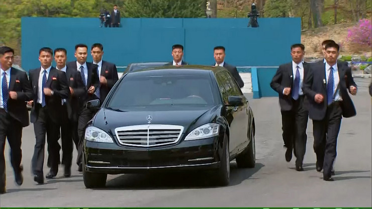Truprojet krijojnë unazën e parë rreth tij dhe bllokojnë pamjen drejtë Kimit në rreth prej 360 gradë. Para tij janë në ecje tre deri në pesë truproje duke përfshirë këtu edhe shefin e zyrës. Pranë tij janë gjithmonë katër deri në gjashtë roje, deri sa prapa tij janë edhe katër ose pesë prej tyre.
