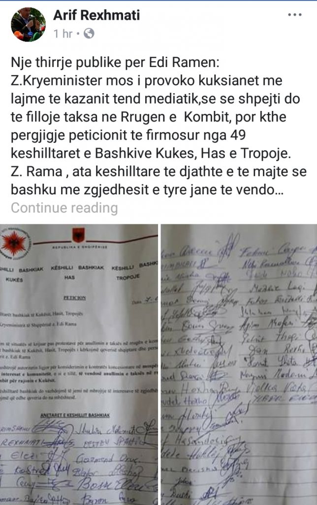 Z.Kryeminister mos i provoko kuksianet me lajme te kazanit tend mediatik,se se shpejti do te filloje taksa ne Rrugen e Kombit, por kthe pergjigje peticionit te firmosur nga 49 keshilltaret e Bashkive Kukes, Has e Tropoje.