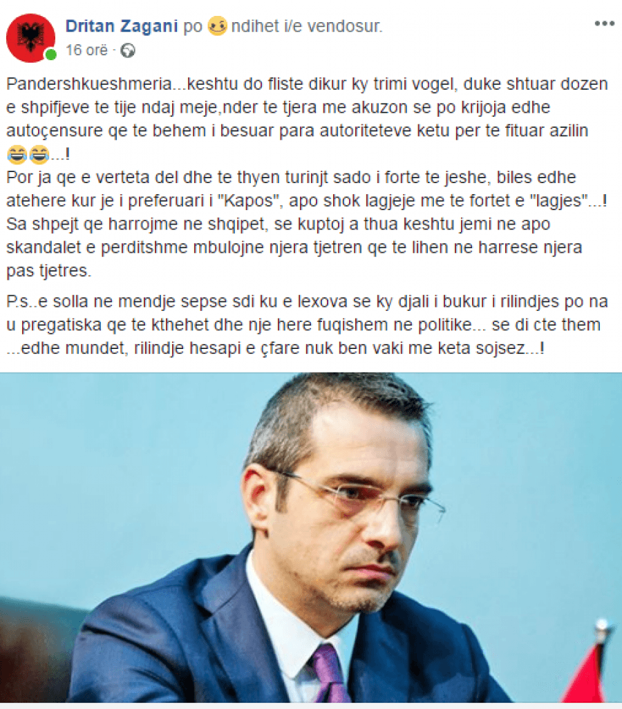 Por ja që e vërteta del dhe të thyen turinjtë sado i fortë teë jesh, biles edhe atëhere kur je i preferuari i “Kapos”, apo shok lagjeje me te fortët e “lagjes”…!”, shkruan Zagani, i cili u largua nga Shqipëria dhe kërkoi strehim politik në Zvicër, pas përplasjeve të vazhdueshme me ish-ministrin e Brendshëm lidhur me trafikun e drogës .