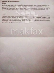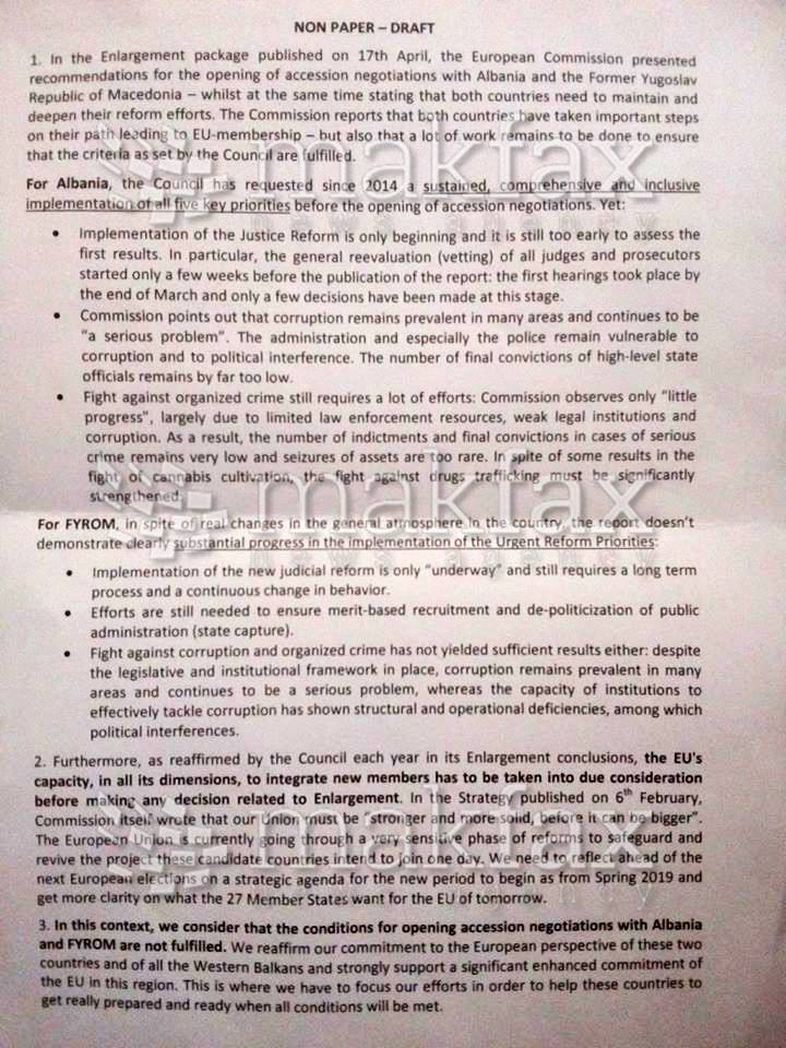 Një dokument po qarkullon në Bruksel lidhur me negociatat mes BE-së dhe Shqipërisë dhe Maqedonisë. Vendimi për hapjen ose jo të negociatave do të jepet në fund të qershorit, por disa nga shtetet anëtare të BE-së mendojnë hapja e negociatave mund të ndodhë vetëm pranverën e vitit të ardhshëm. Dokumenti është botuar nga Makfax, ndërsa ai i përket shteteve që konsiderohen skeptike.