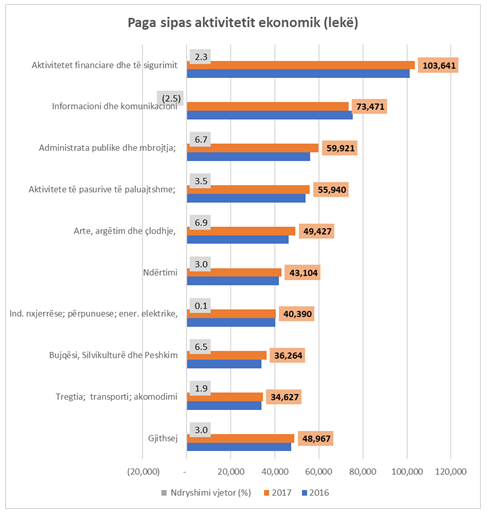 Paga mesatare për të gjitha aktivitetet ekonomike në vend ishte 48,966 lekë, sipas të dhënave të INSTAT, me një rritje prej 3% me bazë vjetore në krahasim me 2016-n.