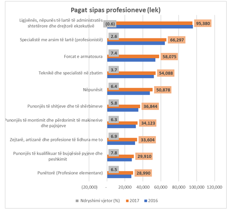 Një tjetër tregues që raporton INSTAT, është ai i pagave sipas profesioneve. Në vend të parë janë “Ligjvënës, nëpunës të lartë të administratës shtetërore dhe drejtorë ekzekutivë”, me një pagë mesatare mujore prej rreth 95 mijë lekësh, me një rëni efare të lehtë në raport me vitin 2016.
