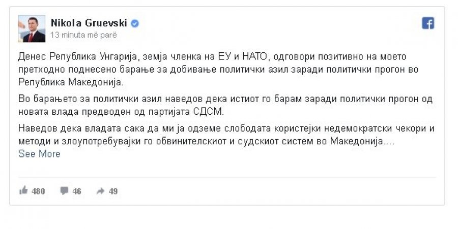 “Sot Republika e Hungarisë, vend anëtare e BE-së dhe NATO-së, u përgjigj pozitivisht në kërkesën time për marrjen e azilit politikë, për shkak të ndjekjes politike në Republikën e Maqedonisë,” thekson Gruveski duke shtuar se në kërkesën e tij për azil kishte theksuar se azilin e kërkon për shkak të ndjekjes politike nga ana e qeverisë së re të udhëhequr nga LSDM:
